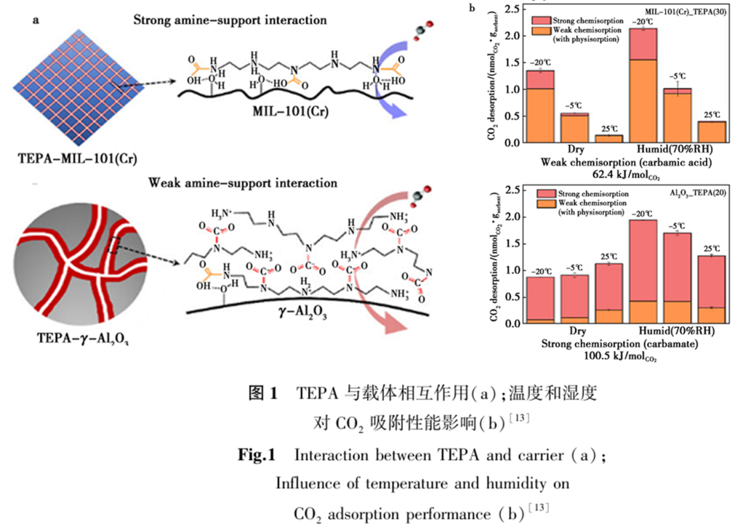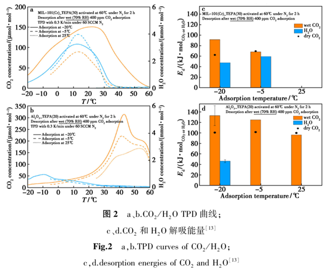 为了研究负载与载体的相互作用对二氧化碳吸附性能的影响,Guanhe等[13]选择商用载体,使用浸渍法制备了γ-Al2O3和MIL-101(Cr)两种载体的四乙烯五胺(TEPA)吸附剂,对其结构性质进行表征,并在400 μmol/mol CO2的条件下测试温度和湿度对CO2吸附性能的影响。研究结果如图1所示。研究中利用TPD曲线以25℃的解吸温度区分强弱吸附,利用原位FTIR技术推断产生强弱吸附的分子进而推断机理。最后利用TPD曲线和DSC技术研究CO2吸附解吸性能如图2所示。