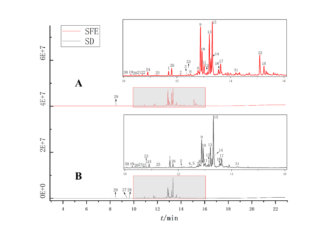 2. 运用GC-MS结合解卷积技术比较分析超临界提取法和水蒸气蒸馏法精油成分,共鉴定出33种成分,其中醇类特征成分种类最多;