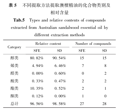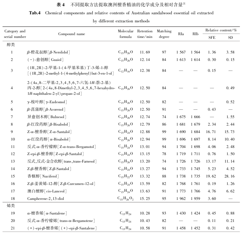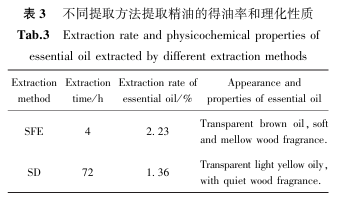 SFE法按1.2.1和2.1中给出的最优提取条件进行操作,SD法按1.2.2中条件进行提取,不同提取方法精油得油率结果见表3。.png)