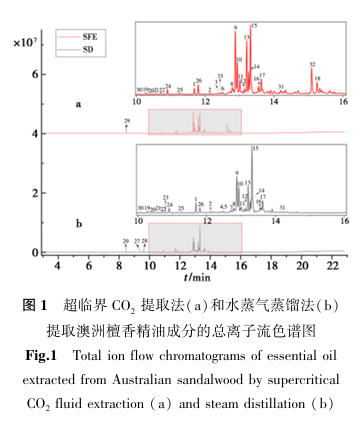 采用GC-MS法分析不同提取方法所得澳檀精油的总离子流色谱图如图1所示,图1中标注编号为1~33的色谱峰对应的化合物情况如表4所示,具体成分鉴定结果见表4、5。.png)