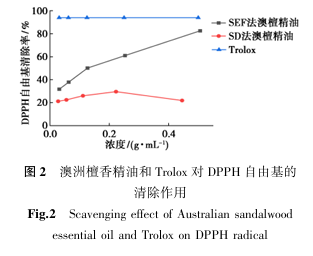 由图2可知,两种提取法获得的澳檀精油对DPPH自由基的清除能力虽整体较弱,且均低于对照品Trolox清除数值,但是随着样品质量浓度的增加,两种澳檀精油的DPPH自由基清除率在一定浓度范围内呈现上升趋势,其中SFE法澳檀精油自由基清除率略高于SD法澳檀精油,其清除率数据最高为82.58%,将数据进一步导入到GraphPad Prism软件进一步拟合计算得到SFE法澳檀精油的IC50值为0.11 g/mL,这些都表明超临界萃取法可能是一种更适用于澳檀精油提取的方法。.png)