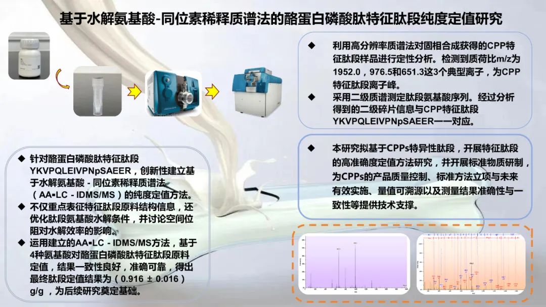 1. 针对酪蛋白磷酸肽特征肽段YKVPQLEIVPNpSAEER,创新性建立基于水解氨基酸 - 同位素稀释质谱法(AA⁃LC - IDMS/MS)的纯度定值方法;