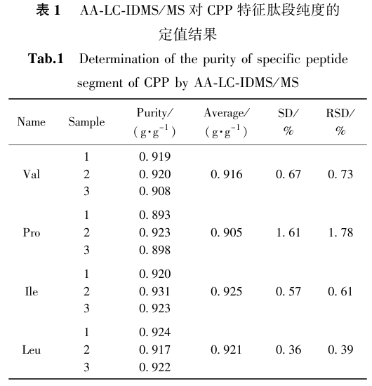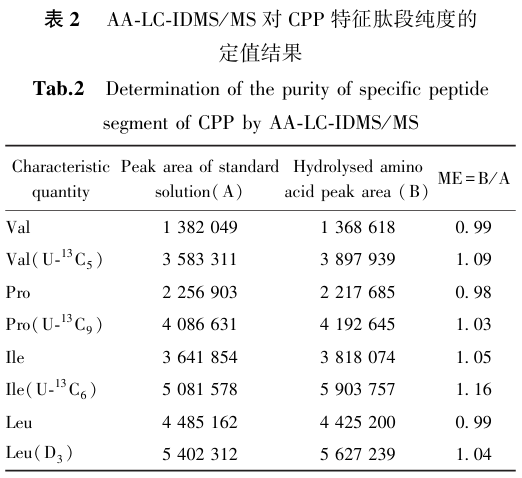 本研究针对CPP 特征肽段 YKVPQLEIVPNpSAEER 进行了定值探究,着重对水解条件予以优化,实施了方法学考察,构建了基于4种氨基酸的水解氨基酸同位素稀释质谱法。基于4种不同氨基酸的肽段定值结果具有良好的一致性,定值准确且可靠,最终肽段的定值结果是 (0.916 ±0.016)g/g。此外,这里的0.016仅考虑了重复性引入的分量。该方法的构建,为后续特征肽段标准物质的研制打下了基础。