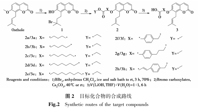 1. 报道了一种以蛇床子素为起始原料,经脱甲基、取代、水解反应合成7-羧酸类蛇床子素衍生物的方法;