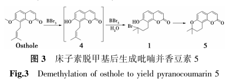 3.探索了BBr3催化蛇床子素7-位甲基脱除反应中,8-溴代烷基香豆素中间体和香豆素并吡喃中间体的形成。