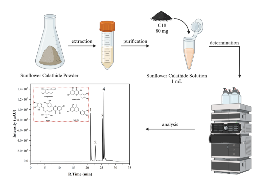 葵花盘粉富含黄酮等多种活性成分,具有降尿酸等药用价值,但目前尚无规范、统一的活性成分检测标准,产品质控手段不足。本研究选择东莨菪素、芦丁、槲皮素和木樨草素作为葵花盘粉产品中降尿酸成分的代表,通过优化样品前处理步骤和色谱分析条件,建立了葵花盘粉产品中4种成分的HPLC分析方法,为葵花盘粉类饮品的产品研发与质量控制提供了方法学参考。.png)
