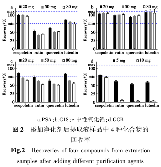 根据植物组织中4种物质含量的特点,以及快速完成、简便操作的要求,选择QuEChERS(Quick, Easy, Cheap, Effective, Rugged, Safe)方法作为样品的前处理方法。添加4种化合物标准物质到样品提取液中,添加含量均为5.00 mg/L,研究样品的净化剂组成。由于提取液本身含有4种物质,所以实际检测到的含量要高于添加含量值。选择PSA、C18、中性氧化铝和石墨化炭黑(GCB)作为候选净化剂,其中PSA、C18、中性氧化铝的候选用量均为每毫升提取液20、50和80 mg,GCB的候选用量为每毫升提取液5、10 mg,每组处理3个重复。样品涡旋混匀后,进行HPLC分析,以添加与未添加净化剂的峰面积之比作为回收率,从而选择合适的净化剂。结果如图2所示。