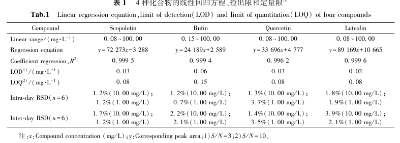 配制了4种物质的混合标准溶液,系列浓度分别为0.08、0.10、0.15、0.25、0.50、1.00、5.00、20.00、50.00、75.00和100.00 mg/L, 采用优化后的仪器检测条件进样,以浓度x为自变量,以峰面积y为因变量,借助Graphpad Prism的线性回归模块得出4种化合物的线性回归方程及回归系数(R2);对4种物质的标准溶液(1.00 mg/L)进行持续地稀释,得到不同浓度的标样稀释液,经仪器进样,得到4种物质峰信噪比(S/N)等于3和10时的对应浓度,作为分析方法的定量限(LOQ)和检出限(LOD)。.png)