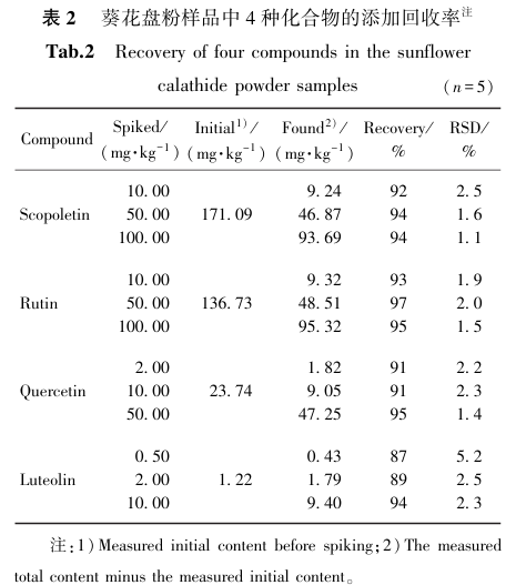 将4种化合物标样分别添加至葵花盘粉样品,物质添加含量见表2,各添加含量的设置参考葵花盘样品的初始含量值,不少于初始含量值的5%。采用建立的前处理和仪器检测方法对样品进行测定,并计算4种化合物的添加回收率。.png)