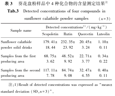 采用建立的HPLC分析方法,测定了一种葵花盘固体饮料产品以及两种产地的葵花盘粉样品,数据结果见表3。结果表明:东莨菪素、芦丁、槲皮素和木樨草素的含量范围分别为68.75~179.41 mg/kg、48.52~232.35 mg/kg、20.45~32.47 mg/kg和0.34~1.10 mg/kg。.png)