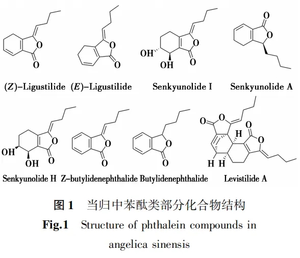 当归里的挥发油主要是由苯酞类、萜烯类、酚类等化合物所构成,其主要成分为苯酞类,其中最常见的藁本内酯就属于此类,其他还包括洋川芎内酯、正丁酰内酯、邻羧基苯正戊酮、当归酮、月桂烯等30余种,当归挥发油中部分苯酞类化合物结构见图1。