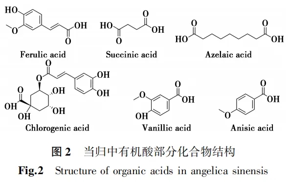当归所含的有机酸中,包括阿魏酸、丁二酸、壬二酸、绿原酸、香草酸、茴香酸等。其中阿魏酸是现行中国药典中用于当归质量控制的指标性成分,且在医学、食品工业、化妆品行业[13]具有广泛应用而深受广泛关注。当归中部分有机酸化合物结构见图2。