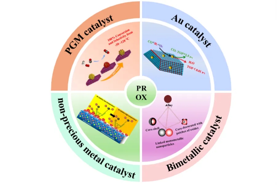 氢气作为一种高效清洁能源,在质子交换膜燃料电池(PEMFC)中具有广阔的应用前景。然而,其原料气中微量的一氧化碳(CO)会毒化电池的铂电极,导致电池性能下降。一氧化碳优先氧化法(CO-PROX)通过选择性地将CO氧化为CO₂,同时避免氢气的消耗,是实现氢气纯化的重要技术。催化剂的性能直接影响CO-PROX的效率,因此催化剂需要同时具备高活性、高选择性和良好的抗毒化能力。本文系统综述了铂族金属(PGM)催化剂、金基催化剂、双金属催化剂以及非贵金属催化剂在CO-PROX中的研究进展。文章探讨了催化剂活性位点的设计、载体效应、反应机理以及稳定性优化策略,为开发低成本、高效的CO-PROX催化剂提供了理论依据和技术方向。