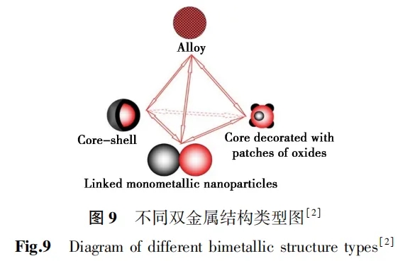 Pt族金属除了Pt、Ru外,Ir、Pb、Rh对PROX反应也有一定的活性。一般来说Ir基催化剂和Rh基催化剂在PROX中性能相当,而Pb基催化剂的CO转化率和CO2选择性较差[25]。除了金属本身的内在催化性能外,调整金属中心或载体的性质也可以提高催化剂的反应活性。1989年,Haruta等[30]报道了负载在适宜载体上的纳米Au粒子对于低温下的CO氧化反应有较高的催化性能,引起了广大学者对Au纳米颗粒的研究热潮。近年来,双金属催化剂因其表面化学成分和纳米结构可调且催化性能优异而备受关注。随着第二种金属的加入,会引起两种金属间的电子转移,从而使性能提升。根据Liu等[2]研究,双金属颗粒的纳米结构可分为核壳型、合金和连接型单金属纳米颗粒以及核上装饰有氧化物团簇的形式。值得注意的是,这些结构在反应过程中可能并不稳定,温度和气氛通常会引起一些结构上的变化,如图9所示。4.1 CoOx催化剂