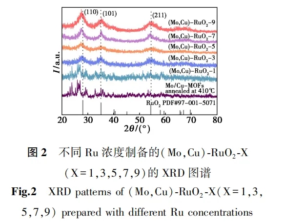 图2为经410 ℃退火后Mo/Cu-MOFs和(Mo,Cu)-RuO2-X的X射线衍射(XRD)图谱,Mo和Cu共掺的RuO2在28.0°、35.1°和54.3°显示出3个衍射峰,分别对应于金红石型的RuO2的(110)、(101)、(211)晶面(PDF No.97 - 001 - 5071)[36]。