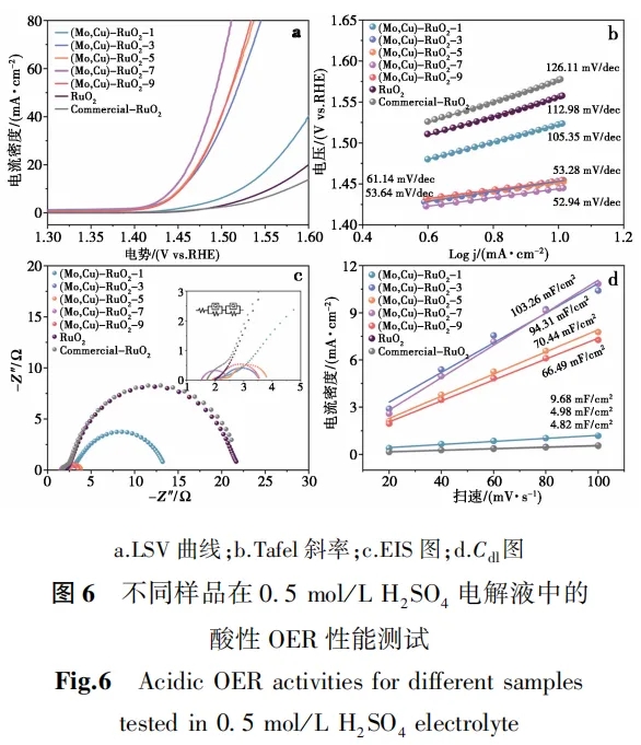 为了评估(Mo,Cu)-RuO2的电催化析氧性能,以0.5 mol/L H2SO4为电解液,在三电极体系中进行了相关测试,为了进行比较,以RuO2和商业RuO2作为对比。