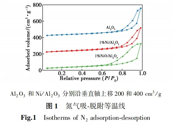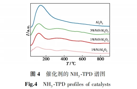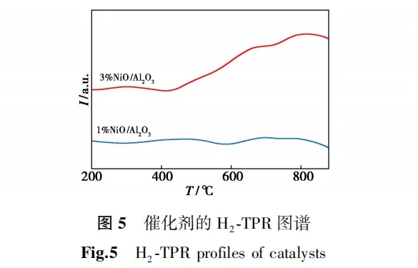 图5展示了催化剂在程序升温还原过程中的还原行为。对于1% NiO/Al₂O₃催化剂,主要在400 ~500 ℃区间出现一个峰,该峰归因于金属与载体之间中等强度相互作用的影响;在650 ~800 ℃区间出现另一个峰,该峰则主要由金属与载体之间的强相互作用导致。