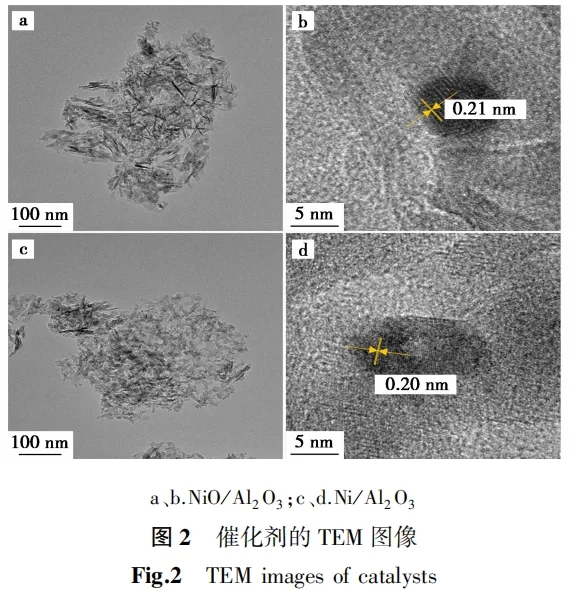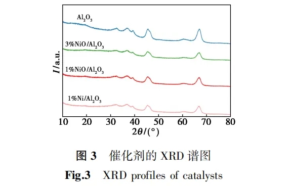 通过透射电镜(TEM)对催化剂的结构形貌进行表征,结果如图2所示。由图2可知,NiO/Al2O3催化剂形成了多孔的基底,它是由不规则的Al2O3纳米粒子堆积而成。同时介孔结构为Ni颗粒的负载提供了空间。2.1.3 XRD测试
