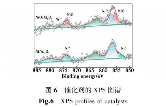 通过XPS分析表征了表面Ni的化学状态,结果如图6所示。对于NiO/Al₂O₃样品,Ni 2p峰的分解和拟合结果表明,镍以NiO(结合能BE = 854.9 eV)和与载体具有强相互作用的Ni²⁺(BE = 856.8 eV)两种形式存在[17],其中NiO占观察物种的比例为52%。