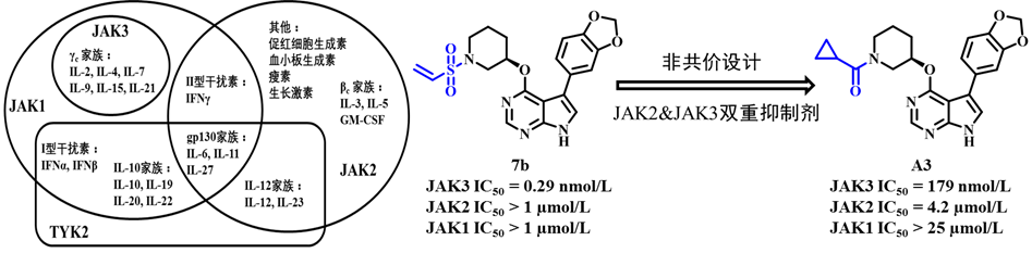 本文通过使用多种非亲电碎片替换高选择性共价JAK3抑制剂7b的亲电碎片,成功获得多个非共价JAK3抑制剂,如A2~A5和A9。其中,最优化合物A3不仅选择性地抑制JAK2,而且在10 µmol/L浓度下能有效抑制小鼠脾脏淋巴细胞的增殖,可作为该系列骨架的先导化合物用以开发非共价选择性JAK2&JAK3双重抑制剂,为自身免疫性疾病的安全治疗提供更多方向。