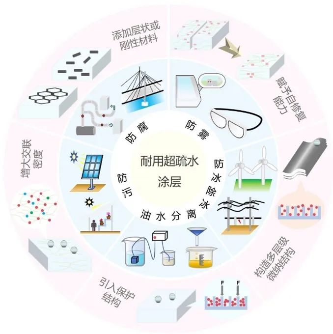 2. 提出五大耐久性提升策略,包括自修复能力构建、多层级微纳米结构设计、保护性结构引入、树脂交联密度优化及层状/刚性材料增强,以解决机械磨损、紫外老化和化学腐蚀等关键挑战。