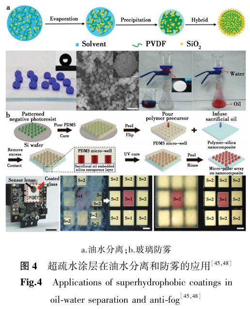 Gao等[45]通过电喷雾技术制备的聚偏氟乙烯(PVDF)/SiO2复合微球,用于油水分离的超疏水涂层,如图4a。