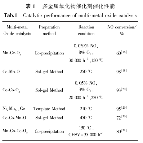 多金属氧化物催化剂(在中低温度范围(100 ~ 320 ℃))中不同互补物的协同作用可以提高催化性能。通过调节稀土元素与其他金属元素的比例,如镧、铈、钇等稀土元素与过渡金属元素的组合,制备出不同结构和性能的氧化物催化剂。其中,锰和二氧化铈复合氧化物因其优异的氧化还原性能、储氧能力和优异的 NO 氧化性能已被多次报道。表1总结了金属氧化物型催化剂的制备方法、反应条件和最高NO转化率。