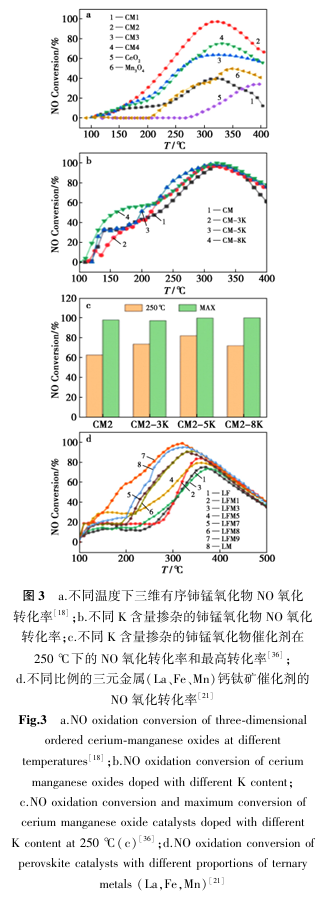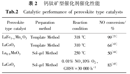 钙钛矿型氧化物因其成本低、良好的活性和热稳定性被证明是一类很有前途的NO氧化催化剂[42]。这类材料的通式为ABO3,其中A位上通常是稀土或碱性阳离子(La或Ce),B位是过渡金属(Mn、Co、Fe和Ni等)。该结构中易形成表面晶格缺陷,使表面晶格氧具有高活性的氧化中心,表现出优异的NO氧化能力。表2总结了钙钛矿型催化剂的制备方法、反应条件和最高NO转化率。.png)