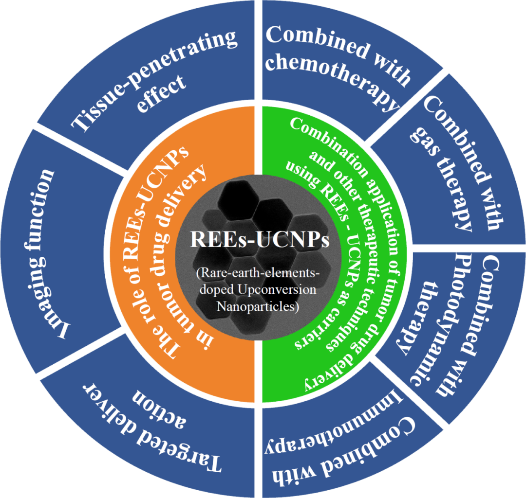 1. 综述了REEs-UCNPs在肿瘤药物传输治疗过程的作用,以及以REEs-UCNPs为载体的肿瘤药物传输与化学治疗、气体治疗、光动力治疗和免疫治疗的联合应用现状
