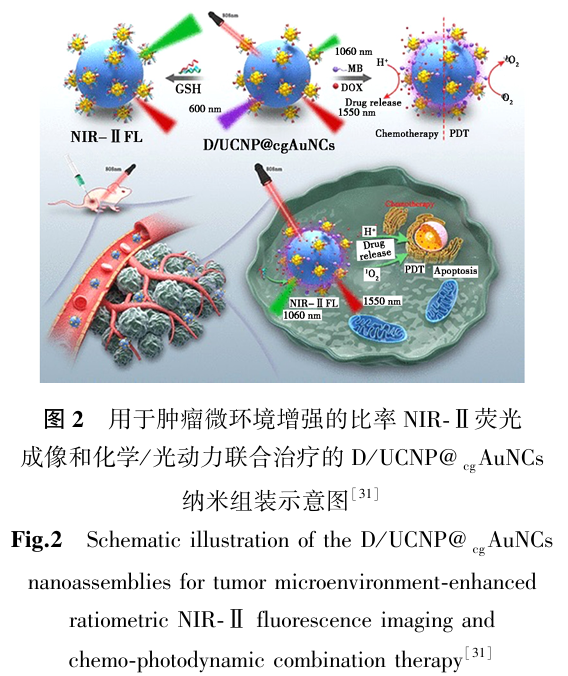 2023年,Hu等[31]将环糊精(CD)和谷胱甘肽(GSH)修饰的的金纳米团簇(cgAuNCs)偶联在降/升转换纳米颗粒(D/UCNPs)NaErF4@NaYF4的表面,制备了相应纳米组装体,原理如图2所示。cgAuNCs对内源性GSH可增强荧光响应,在808 nm激发光照射下,该组装体显示出3个发射带(波长分别为660、1060和1550 nm)输出用于肿瘤成像的荧光信号,同时实现荧光成像和光动力学组合治疗肿瘤,此外,还利用CD的空腔负载阿霉素(DOX)达到了药物传输的效果,为设计用于肿瘤的体内成像和治疗的多功能纳米平台提供了新的方法,使REEs-UCNPs在药物传输中优秀的显像能力在肿瘤微环境中得以应用。