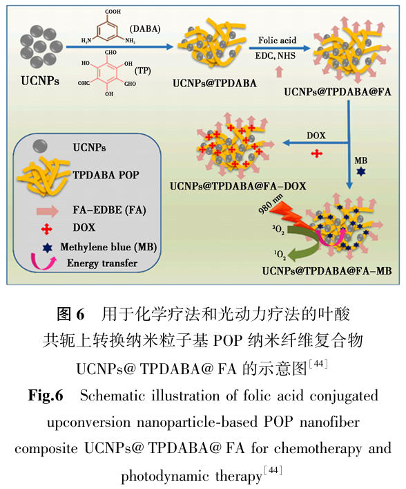 2023年,Mukherjee等[44]将叶酸(FA)封装于NaYF4:Yb,Er中,嵌入多孔有机聚合物纳米纤维中,然后将功能化FA与有效靶向癌细胞A549的复合物连接,最后装载抗癌药物DOX,得到了一种用于光动力治疗研究的复合材料(UCNPs@TPDABA@FA),原理如图6所示。