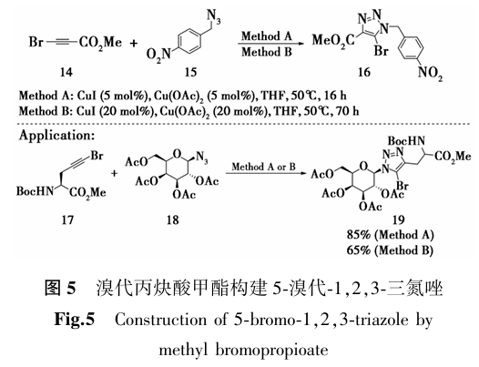 2007年,荷兰拉德堡德大学Rutjes课题组[9]报道了首例铜催化内炔与叠氮的[3+2]环加成反应(图5)。采用溴代丙炔酸甲酯(14)和对硝基苄基叠氮(15),以高产率和高区域选择性的方式合成了5-溴代-1,2,3-三氮唑(16)。.png)