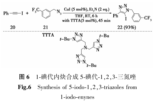 2009年,美国斯克利普斯研究所Fokin等[10]采用碘化亚铜催化有机叠氮化合物(21)与1-碘代内炔(20)发生CuAAC反应,在反应中加入了2 equiv的三乙胺作为配体,以四氢呋喃为溶剂,室温条件下反应6 h,以高产率(93%)得到5-碘代-1,2,3-三氮唑(22)(图6)。