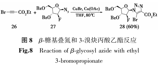 2017年,郑州大学Chang等[12]从3-溴炔丙酸乙酯(26)和β-脱氧核糖基叠氮(27)出发,以良好的收率(60%)制备了相应的5-溴代-1,2,3-三氮唑(28),该化合物是一种具有抗病毒、抗肿瘤活性的氮杂贝壳杉烷类似物(图8)。