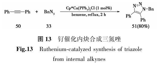 2005年,由香港科技大学贾国成和美国斯克利普斯研究所Fokin等[20]报道使用过渡金属钌催化内炔合成三氮唑,即钌催化叠氮-炔烃环加成反应(Ruthenium-catalyzed Azide Alkyne Cycloaddition, 简称RuAAC),如图13所示。.png)