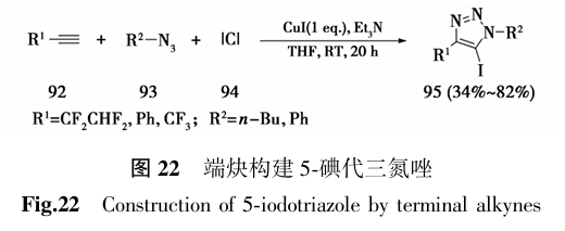 2005年,中国科学院上海有机化学研究所Wu课题组[32]报道了通过引入亲电试剂制备5-碘代三氮唑化合物(95)的方法(图22)。.png)