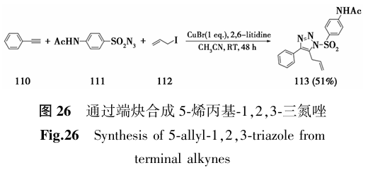 2006年,美国斯克利普斯研究所Fokin等[37]报道了端炔与磺酰基叠氮发生的CuAAC反应,生成的5-铜-三氮唑中间体可以被烯丙基碘捕获,生成5-烯丙基-1,2,3-三氮唑(图26)。.png)