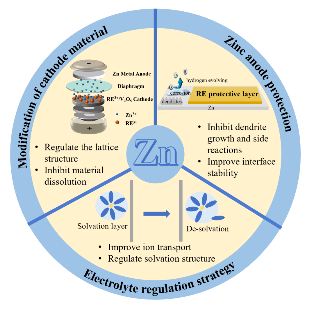 1. 系统梳理了稀土材料在水系锌电池电极、电解液等各部分的应用,从多种角度探讨其对电池性能的影响;