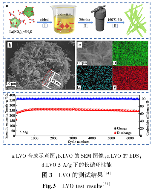 Xu等[34]通过简单的水热法(图3a)制备了具有稳定隧道结构、高容量和长循环寿命优点的LaVO4(LVO)。图3b展示了LVO的SEM扫描图像,显示出清晰的一维纳米棒形态,这些纳米棒适度分散,形成一种鸟巢图案的网格,提供较多活性位点。图3c为LVO的EDS图像,表明La、O、V这3种元素均匀分布。利用钒元素多氧化态、多活性位点的特点,电池在1A/g电流下保持325 mA h/g的高容量,循环100次不出现容量衰减,并具有超长的循环寿命。图3d给出了5A/g的长循环性能,在循环6500次后容量保持率为93.5%。鉴于LVO的优点,通过普通真空过滤制备了柔性LVO/CNT薄膜,并组装了准固态Zn//LVO/CNT电池。柔性电池也呈现出符合预期的良好性能。