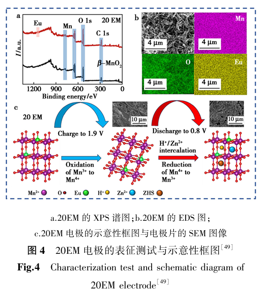 Eu元素具有良好的导电性和稳定的化学性质,适合作为MnO2的改性材料。2024年,Han等[49]的工作将稀土元素Eu掺杂到β-MnO2(命名为20EM)中作为AZIB的正极材料。图4a显示了XPS的全谱,其中包括碳(284.8 eV)、锰(641和654 eV)和氧(532.5 eV)元素。与β-MnO2相比,20EM中有1个Eu3d(1136 eV)峰,这表明Eu元素成功掺杂到β-MnO2中。