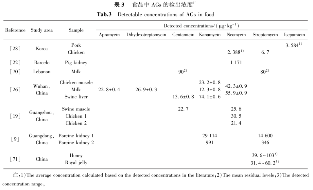近年来,随着痕量分析技术的大力发展,越来越多的研究开始关注食品中AGs的残留情况。相比较于食品中其他类抗生素残留特征分析,食品中AGs的污染特征研究较有限。从表3可看出,目前主要在动物源食品中(包括猪肉、鸡肉、蜂蜜和牛奶等)检出AGs。从研究地区来看,国内外食品中AGs的检出浓度和种类具有较大差异。另一方面,迄今为止,关注植物源食品中AGs残留的研究较少。