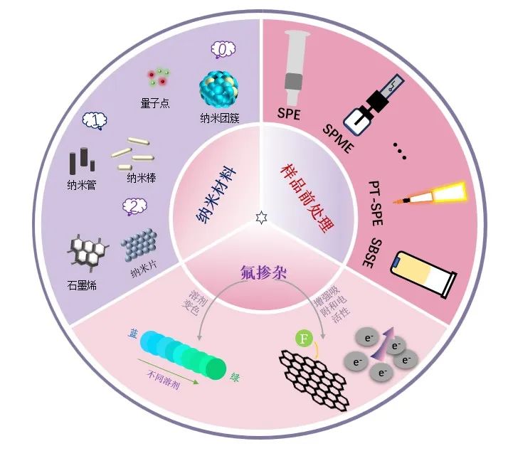 1. 详细介绍了纳米材料的类型和特点,以及含氟纳米材料检测抗生素的方法,如荧光碳点、比色法和表面增强拉曼散射等检测方法;