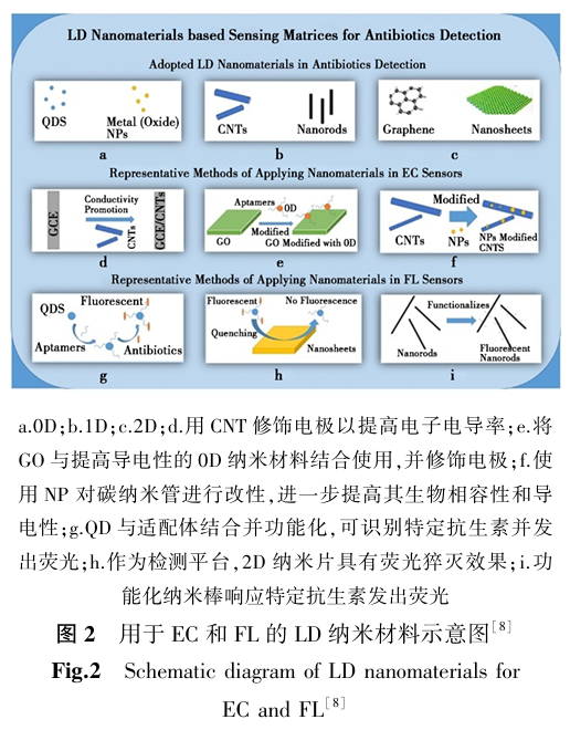 由于不同的纳米材料其形态和尺寸不同,因此具有不同的有益性能。抗生素检测采用的纳米材料类型如下:0D材料包括纳米团簇、纳米颗粒和量子点;1D材料包括纳米线、纳米管和纳米棒;2D材料包括纳米片和纳米膜[8]。.png)