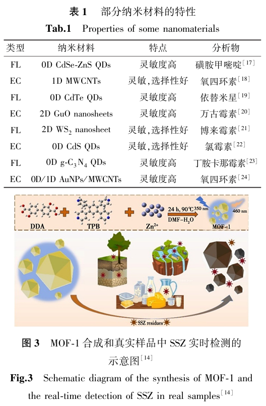 随着纳米生物技术的发展,电化学(EC)传感器和荧光(FL)传感器是目前最常见的抗生素检测传感器,用于EC和FL的LD纳米材料如图2所示,其共同特点是响应速度快、操作方便、便携性好、检测限低[8](表1)。Ju等[14]发现了一种具有高度选择性和敏感性的羟基功能化的含锌金属有机骨架(MOFs)荧光探针并制备了相应的便携式检测试纸条,可用于水、牛奶和土壤中柳氮磺胺吡啶残留的检测以及磺胺吡啶的实时检测,如图3所示。