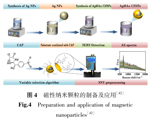 如图4所示,Liu等[42]提出了一种基于磁性纳米颗粒和SERS纳米标签的多重分析策略,用于识别不同类型的抗生素,氯霉素和四环素的检测限分别为159.49和294.12 fg/mL。磁性纳米颗粒可以简单地通过磁力分离显著提高检测效率,降低分析成本,简化操作。基于磁性纳米颗粒的SERS检测方法则具有较高的灵敏度、多重检测能力和良好的稳定性。