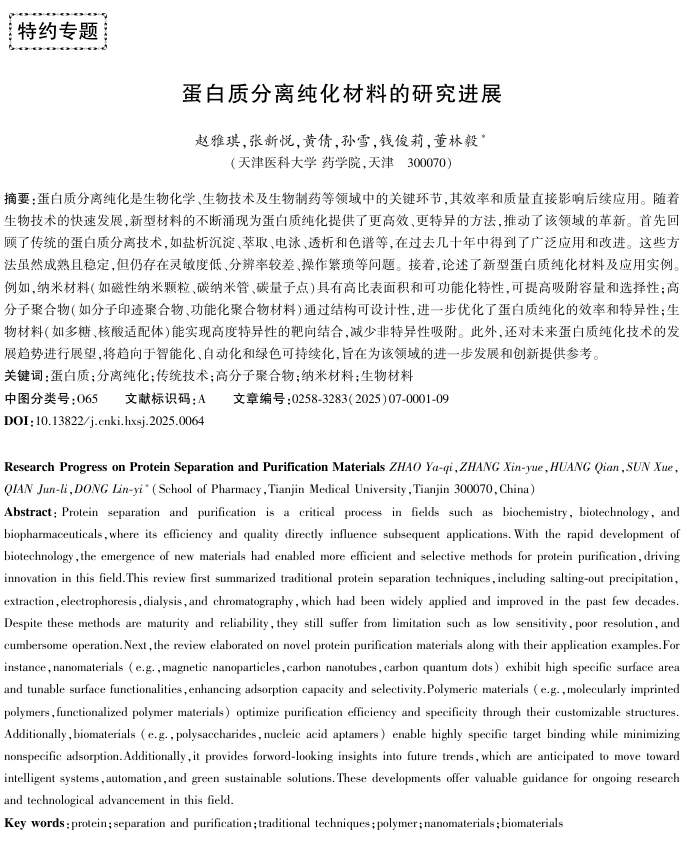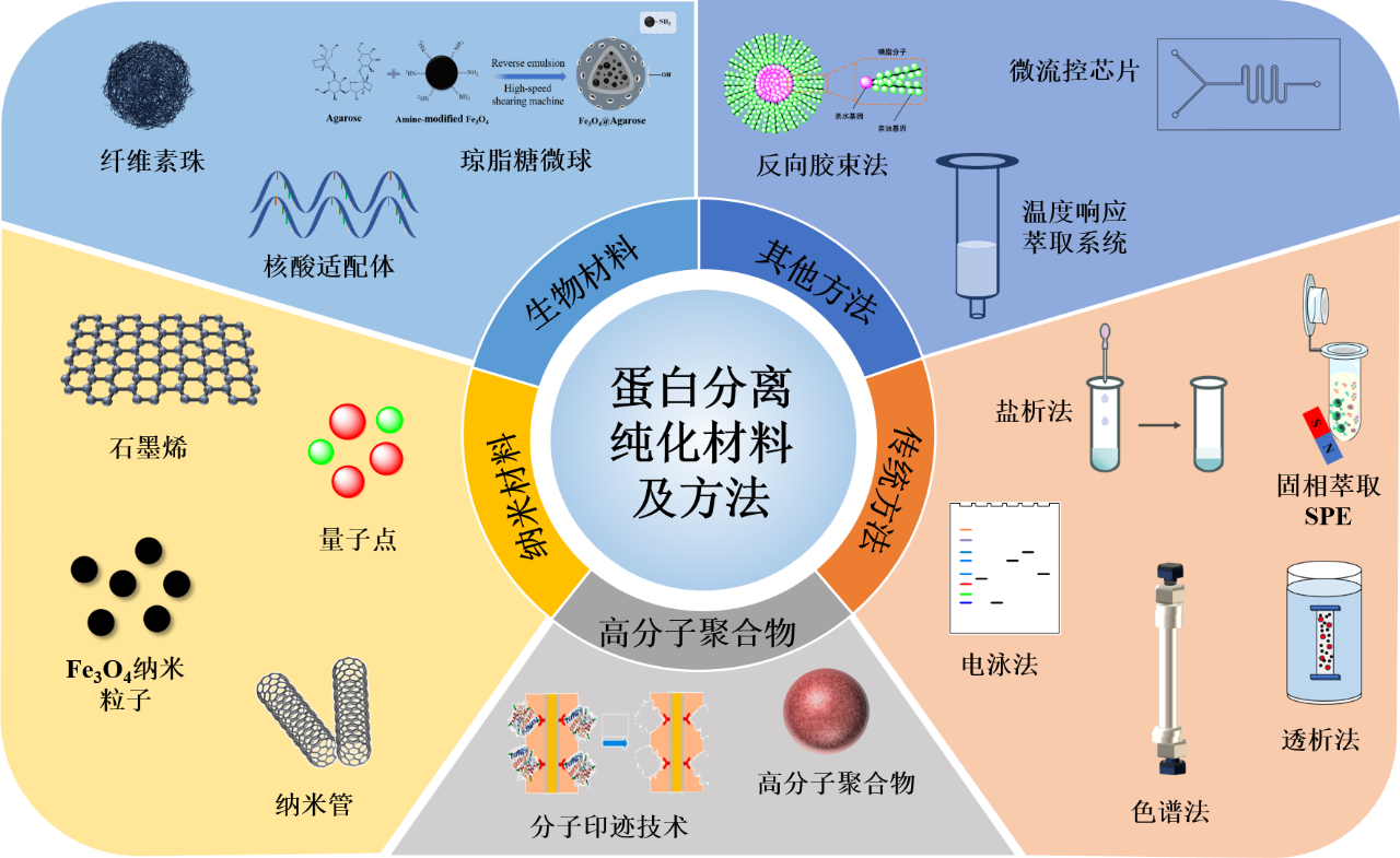 1. 文章系统梳理了传统蛋白质分离纯化方法的应用和局限性,以及新型蛋白分离纯化材料的制备及应用过程;