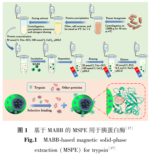 利用蛋白质在两种不相溶的溶剂中的分配差异进行分离的方法称为萃取法。常见的萃取体系包括双水相体系、固相萃取等。Zhao等[17]制备了微米大小的Fe3O4@琼脂糖-苯甲脒磁珠(MABB),对胰蛋白酶的最大吸附能力达1946 mg/g,引入磁性纳米粒子,构建了基于MABB的MSPE策略(图1),成功用于草鱼内脏中胰蛋白酶纯化,保证了纯化后的胰蛋白酶的生物活性。