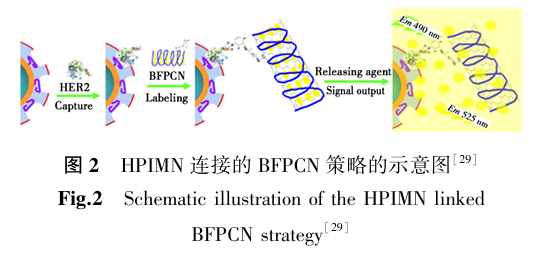碳纳米材料包括碳纳米管和石墨烯等,具有较大的比表面积和独特的电学、力学性质。碳纳米管表面可以通过化学修饰引入亲水性基团或特异性识别基团,从而实现对蛋白质的选择性吸附。Yu等[29]将肽取向表面印迹磁性纳米颗粒与碳纳米管基荧光信号输出装置连接起来(图2)。