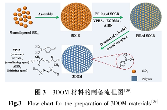近年来,聚合物因其柔性改性、高表面积、可调结构和稳定的物理化学性能等优良性能而被广泛研究。功能化聚合物是通过在聚合物主链上引入特定功能基团来实现对蛋白质的选择性识别和结合。Zhao等[38]以改性疏水性Fe3O4纳米粒子、苯乙烯和甲基丙烯酸缩水甘油酯为原料,通过两步分散聚合合成了微米级超顺磁性聚合物球体(图3)。