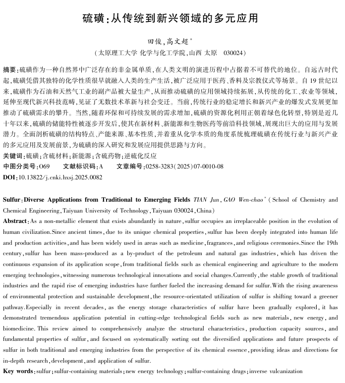 硫磺作为一种自然界中广泛存在的非金属单质,在人类文明的演进历程中占据着不可替代的地位。自19世纪以来,硫磺作为石油和天然气工业的副产品被大量生产,从而推动硫磺的应用领域持续拓展。当前,传统行业的稳定增长和新兴产业的爆发式发展更加推动了硫磺需求的攀升,且随着环保和可持续发展的需求增加,硫磺的资源化利用正朝着绿色化转型。特别是近几十年以来,硫磺的储能特性被逐步开发后,使其在新材料、新能源和生物医药等前沿科技领域,展现出巨大的应用与发展潜力。